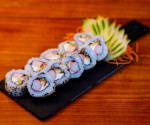 Uramaki de Salmão fresco, kani, cream cheese e cebolinha.
