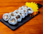 Uramaki de Salmão e camarão maçaricados, Croc , Molho Express (nosso incrível molho da casa) e cebolinha. *Croc é nossa massinha artesanal super crocante, imperdível!